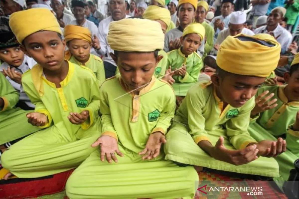 Sejumlah santri Tarbiah Islamiah Mazhab Syafi'i berdoa bersama di Balai Tinggi Tarbiah, Desa Kandang, Lhokseumawe, Aceh, Jumat (5/4/2019). Kegiatan itu dalam rangka memperingati Haul ke-1236 wafat Imam Syafi'i di Provinsi Aceh. ANTARA FOTO/Rahmad/foc.