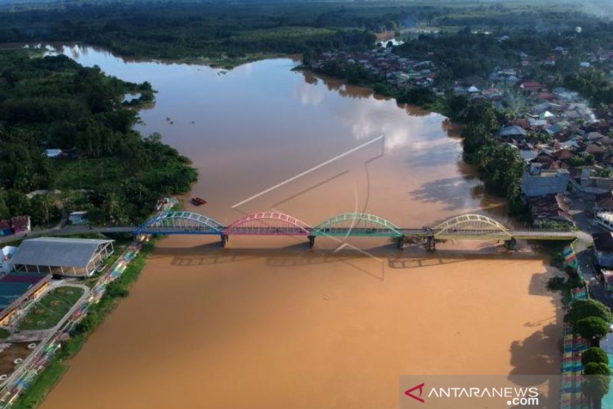Jembatan Betrix membentang di atas aliran Sungai Tembesi, Sarolangun, Jambi, Minggu (28/4/2019). Jembatan yang diambil dari nama cucu Ratu Wilhelmina, Putri Beatrix Wilhelmina Armgard dan diresmikan pemakaiannya pada 1939 tersebut merupakan salah satu bangunan peninggalan kolonial Belanda di Sarolangun, Jambi yang kini berkembang menjadi salah satu ikon wisata daerah itu. ANTARA FOTO/Wahdi Septiawan/aww.