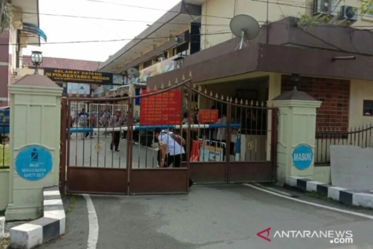 Gerbang Polrestabes Medan tertutup rapat usai terjadinya diduga bom bunuh diri. (ANTARA/Irsan)