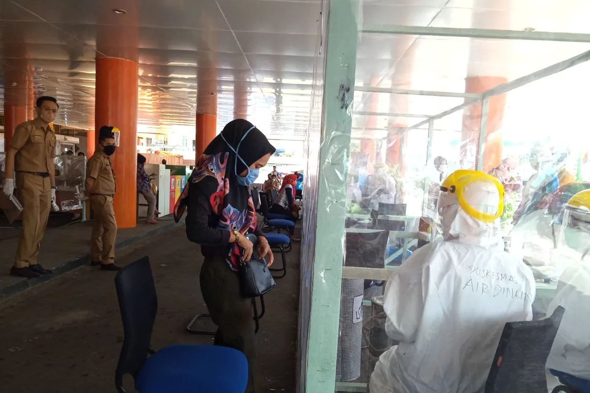 Padang (ANTARA) - Dinas Perdagangan Kota Padang kembali melakukan tes swab tenggorokan dan hidung pada setiap pedagang dan pengunjung yang pernah beraktivitas di Pasar Raya Padang saat hari pertama penerapan masa transisi jelang kenormalan baru di Padang, Sumatera Barat, Senin.