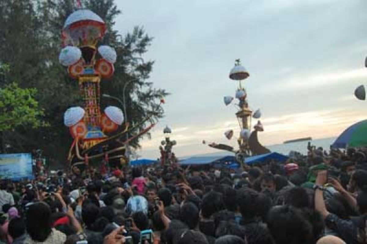 Jarum jam sudah lewat pukul 18.00 WIB, hanya kepala orang-orang yang terlihat di pantai Gandoriah, Pariaman, Sumatera Barat saat digelarnya puncak Pesta Budaya Tabuik Pariaman pada Minggu (19/12), permainan anak nagari setiap bulan muharram.