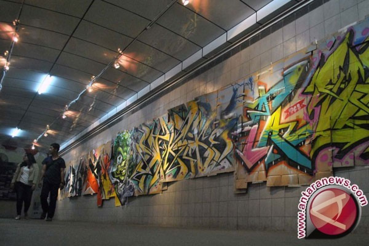 Dokumentasi--Pameran Lukisan Graffiti. Pejalan kaki melihat pameran lukisan graffiti dan mural di jembatan penyeberangan bawah tanah (Underpass), jalan raya Pajajaran, Kota Bogor, Jabar, Selasa (16/9). Pameran tujuh lukisan graffiti dan puluhan lukisan mural dengan media kanvas dan kardus karya komunitas Rain City Strike ini sebagai cara untuk memperbaiki citra dan pelaku seni jalanan untuk melakukan kegiatannya di tempat yang tepat dan tidak merusak fasilitas umum. (ANTARA FOTO/Arif Firmansyah) (1)