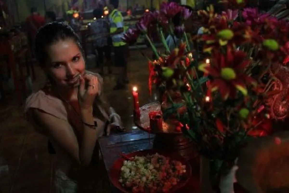 Wisatawan asal Jerman, Elianora Mulyukova menyium bunga melati menjelang perayaan Imlek di Kelenteng See Hin Kiong, Kota Padang Sabtu (9/2) malam. (antarasumbar.com)