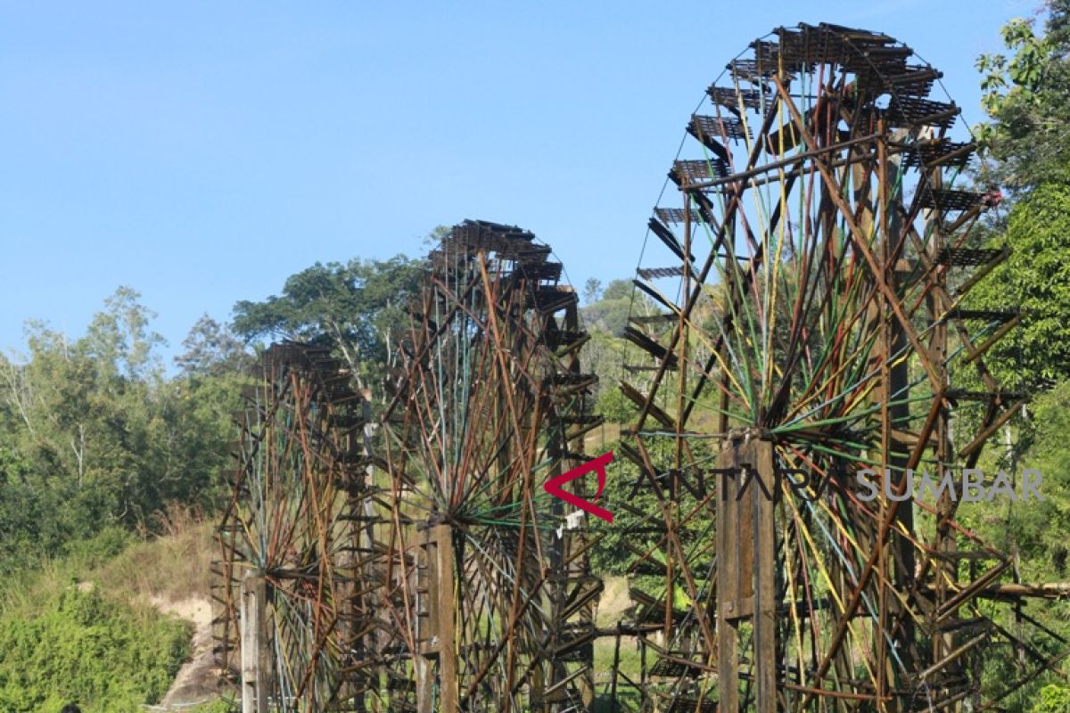 Pengunjung berenang di kawasan kincir air raksasa yang berdiameter 14 meter di Padang Data, Kab.Tanah Datar, Sumbar, Sabtu (17/2). Kincir air raksasa tradisonal tersebut berfungsi untuk mengaliri air kesawah dan kini jadi dadakan wisata alam yang ramai dikunjungi wisatawan pada hari libur dan akhir pekan. ANTARA SUMBAR/Adi Prima/Maril/18
