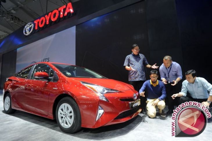 Executive General Manager PT Toyota-Astra Motor (TAM) Fransiscus Soerjopranoto (kiri) dan Manager Public Relations TAM Rouli Sijabat (kedua kanan), mendengar penjelasan Product Knowledge TAM Gandhi Ahimsaputera (kedua kiri) dan Manager Product Planning Development Indra Madyana (kanan) mengenai Toyota Prius Gen. 4 yang bersama C-HR merupakan mobil generasi pertama Toyota yang dilahirkan dari platform Toyota New Global Architecture (TNGA), di stan Toyota pada Gaikindo Indonesia International Auto Show (GIIAS) 2017, di ICE BSD City, Serpong, Banten, Selasa (15/8/2017) . Melalui TNGA, Toyota berupaya menghadirkan kendaraan yang tidak hanya nyaman dan mudah dikendarai, tapi juga didukung teknologi masa depan untuk mencapai kendaraan dengan tingkat keselamatan tinggi dan ramah lingkungan. (ANTARA /Audy Alwi)