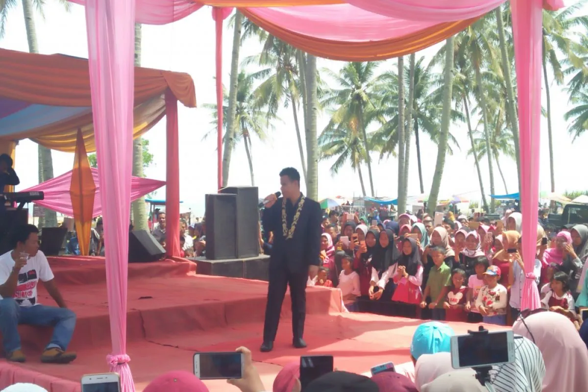 Painan, (Antaranews Sumbar) - Jebolan kompetisi liga dangdut di salah satu stasiun televisi swasta asal Sumbar Arif menghibur ribuan wisatawan di Pantai Sumedang, Kecamatan Ranah Pesisir, Kabupaten Pesisir Selatan, Sumatera Barat, Rabu.