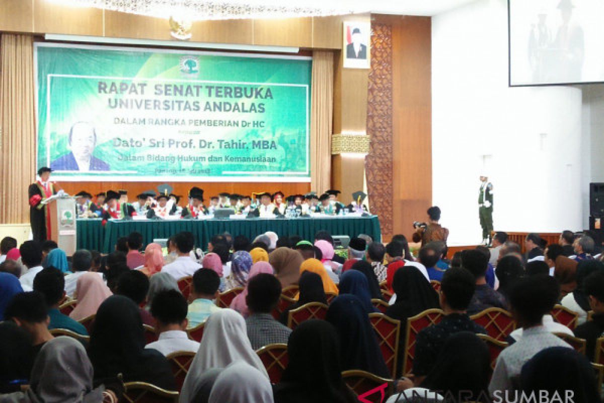 Padang, 16/7 (Antara) - Universitas Andalas (Unand) Padang, Sumbar memberikan penghargaan Doktor honoris causa (HC) atau kehormatan kepada tokoh kemanusiaan internasional Tahir pada rapat senat luar biasa di Padang, Senin.
