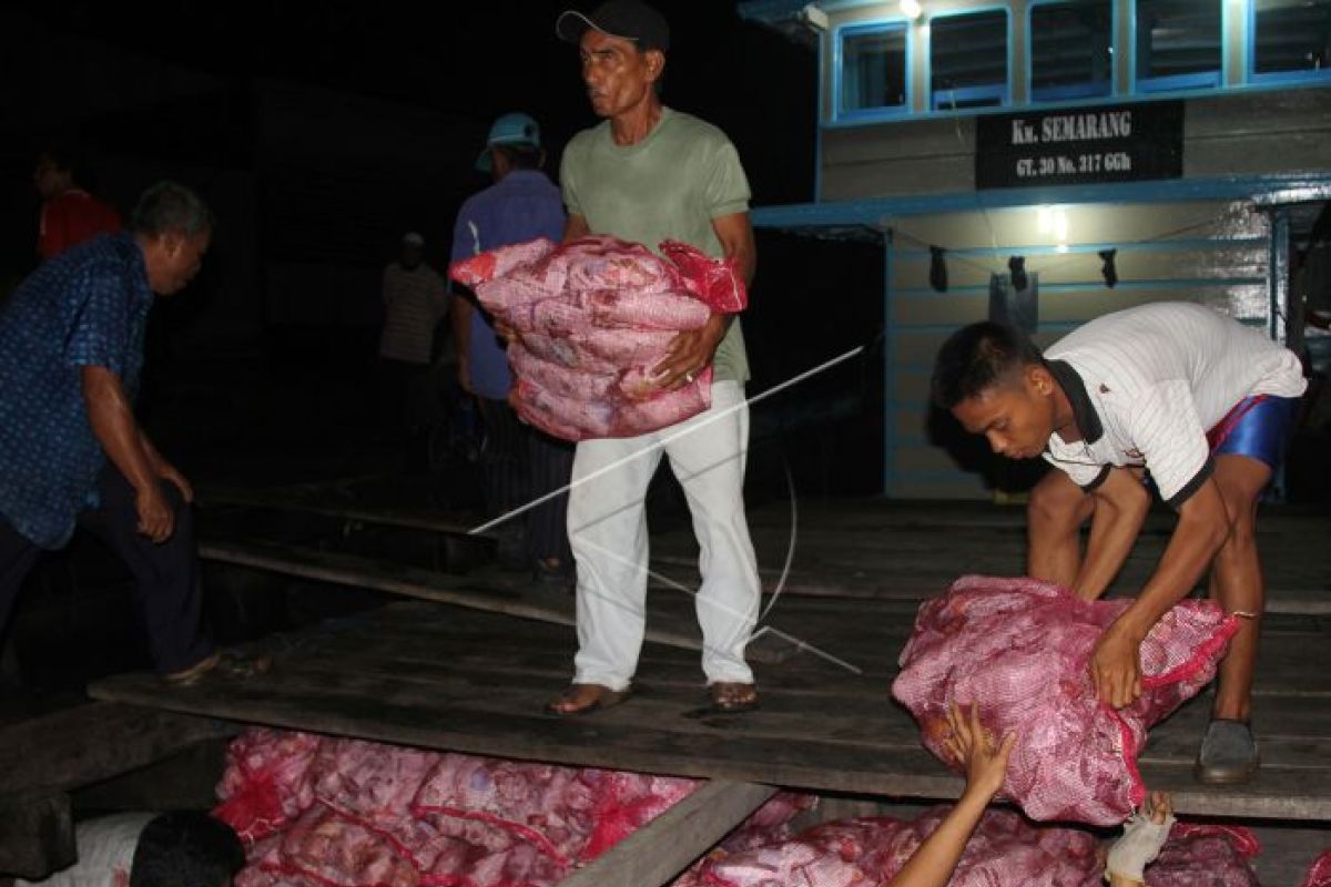 Sejumlah pekerja mengangkat goni jaring berisi keladi ungu (Caladium L) yang dibungkus kertas koran ke dalam palka kapal untuk diekspor ke Melaka di pelabuhan Petak Panjang kota Dumai, Dumai, Riau, Senin (23/7). Permintaan ekspor terhadap keladi ungu Rokan Hilir dan kayu manis (Cinnamomum Verum L) Sumatera Barat terus meningkat dari negara tetangga seperti Malaysia lewat Pelabuhan Dumai, dimana seorang pedagang dapat mengekspor keladi ungu sebanyak delapan ton dan kayu manis sebanyak enam ton ke negara itu. ANTARA FOTO/Aswaddy Hamid/aww/18.