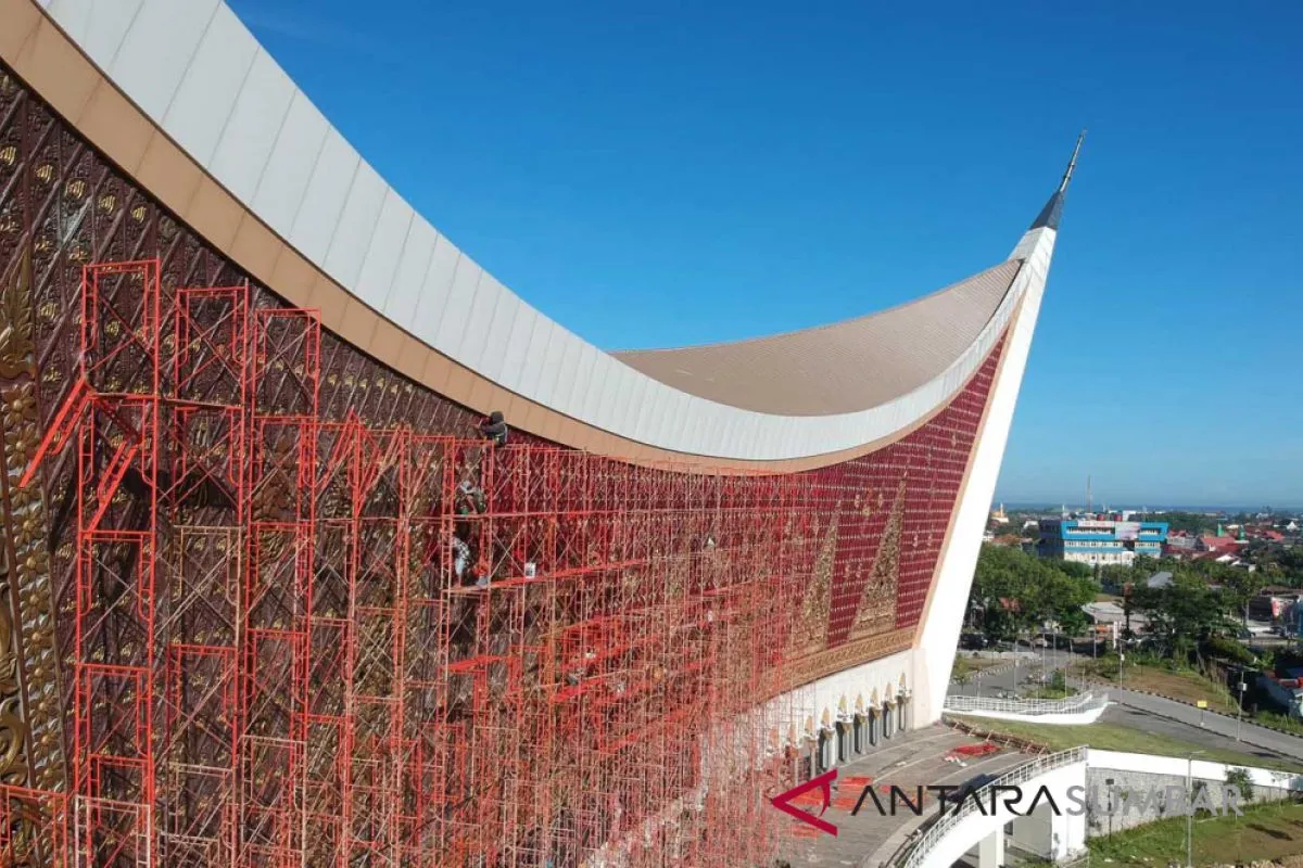 Pekerja melakukan pengecatan ulang eksterior Masjid Raya Sumatera Barat, di Padang, Senin (13/8). Pengecatan ulang tersebut dilakukan dalam rangka perawatan masjid yang merupakan ikon provinsi itu. ANTARA SUMBAR/Iggoy el Fitra/Maril/18