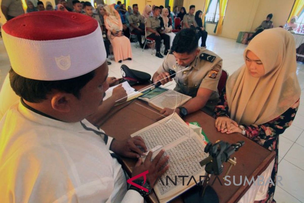 Personel Polisi Polres Lhokseumawe bersama pasangan mengikuti uji baca Alquran saat berlangsung Sidang Dewan Kebijakan Jabatan dan Kepangkatan (Wanjak) di Polres Lhokseumawe, Aceh, Kamis (20/9). Uji kemampuan dalam sidang Wanjak itu merupakan salah satu persyaratan khusus implementasi syariat Islam bagi anggota Polri di Aceh untuk menikahi calon pasangan yang nantinya akan menjadi anggota Bhayangkari. ANTARA FOTO/Rahmad/kye/18.