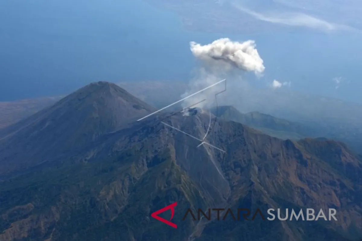 Gunung Sangiang Api terlihat dari ketinggian di Pulau Sangiang, Bima, Nusa Tenggara Barat, Jumat (12/10). Sangiang Api merupakan salah satu gunung berapi paling aktif di Kepulauan Sunda Kecil yang terdiri dari dua kerucut vulkanik, Doro Api 1.949 meter (6.394 kaki) dan Doro Mantoi 1.795 m (5.889 ft). ANTARA FOTO/Indrianto Eko Suwarso/foc/18.