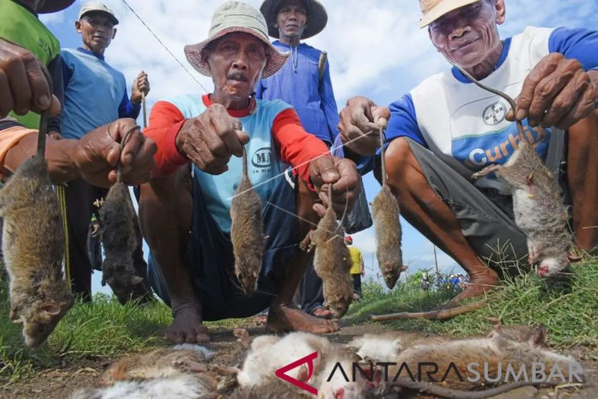 Petani memperlihatkan tikus yang berhasil ditangkap saat gropyokan tikus di Desa Kedungrejo, Kecamatan Pilangkenceng, Kabupaten Madiun, Jawa Timur, Jumat (18/1/2019). Petani di wilayah tersebut mengeluhkan banyaknya hama tikus, sehingga mereka sering melakukan gropyokan tikus guna mengendalikan hama perusak tanaman padi. ANTARA FOTO/Siswowidodo/ama.