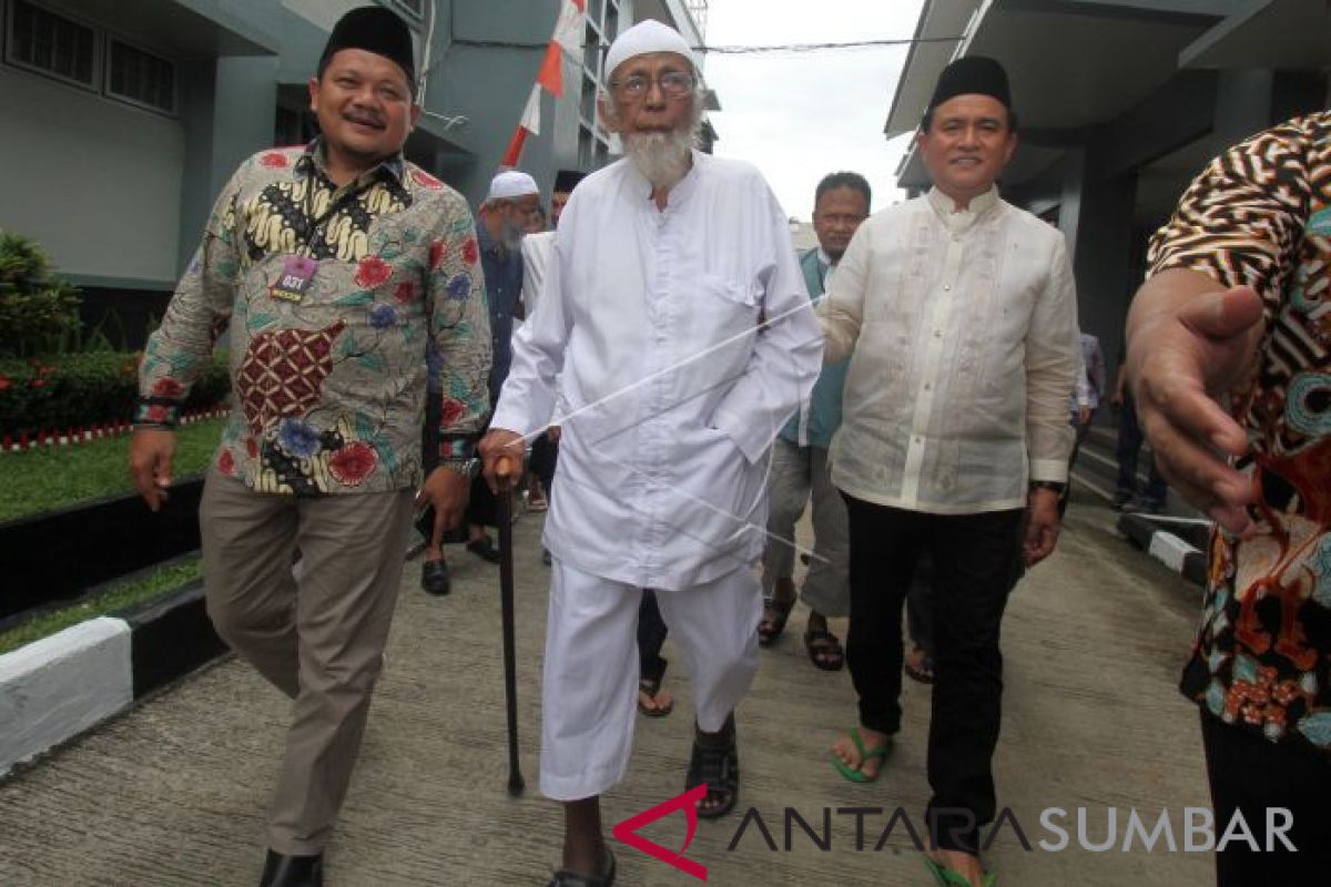 Kuasa hukum capres Joko Widodo dan Ma'ruf Amin, Yusril Ihza Mahendra (kanan) mengunjungi narapidana kasus terorisme Abu Bakar Baasyir (tengah) di Lapas Gunung Sindur, Bogor, Jawa Barat , Jumat (18/1/2019). Abu Bakar Baasyir akan dibebaskan dengan alasan kemanusiaan karena usia yang sudah tua dan dalam keadaan sakit serta memerlukan perawatan. ANTARA FOTO/Yulius Satria Wijaya/pras.