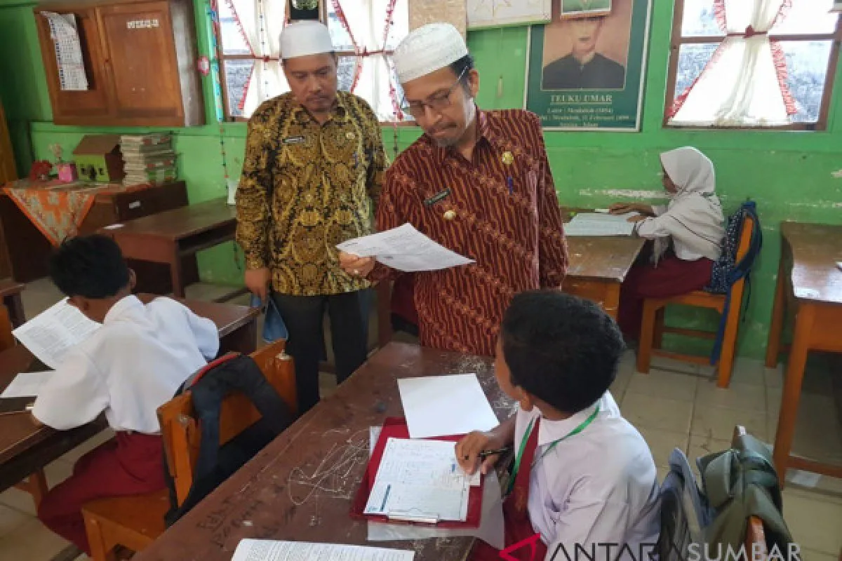 Bupati Pasaman Barat, Syahiran didampingi Kepala Dinas Pendidikan, Marwazi meninjau ujian Nasional Sekolah Dasar 2018 di SD 02 Pasaman, Kamis (3/5). (Antara Sumbar/Altas Maulana)