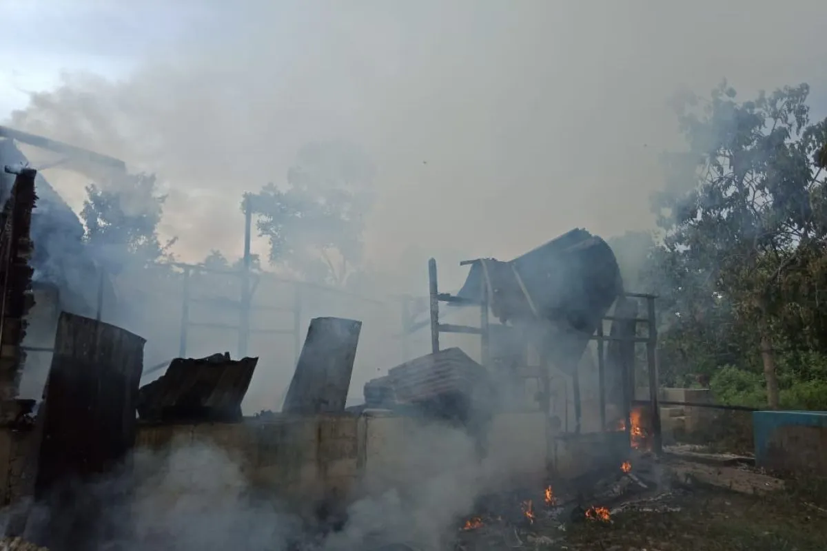 Kebakaran rumah semi permanen itu hanya tinggal puing-puing yang masih menyisakan sedikit kepulan asap.