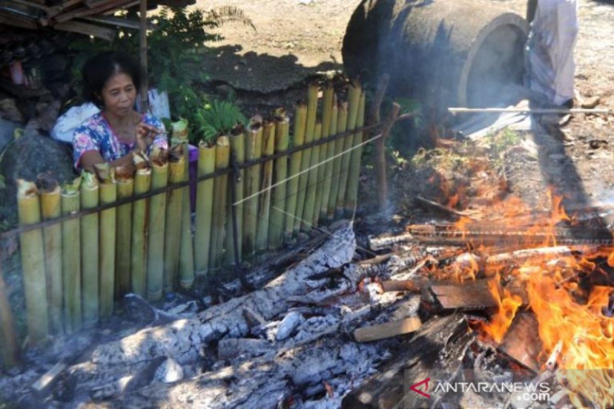 Seorang ibu membakar lemang atau "Malamang" menyambut bulan ramadhan di depan rumahnya, di Lambungbukik, Pauh, Padang, Sumatera Barat, Kamis (2/5/2019). Tradisi Malamang, yakni memasak lemang yang terbuat dari beras ketan putih dan santan yang dimasukkan ke dalam bambu kemudian dibakar, merupakan tradisi di Minangkabau dalam rangka menyambut bulan ramadhan dengan menyajikan lemang untuk mempererat silaturahmi. ANTARA FOTO/Iggoy el Fitra/hp.