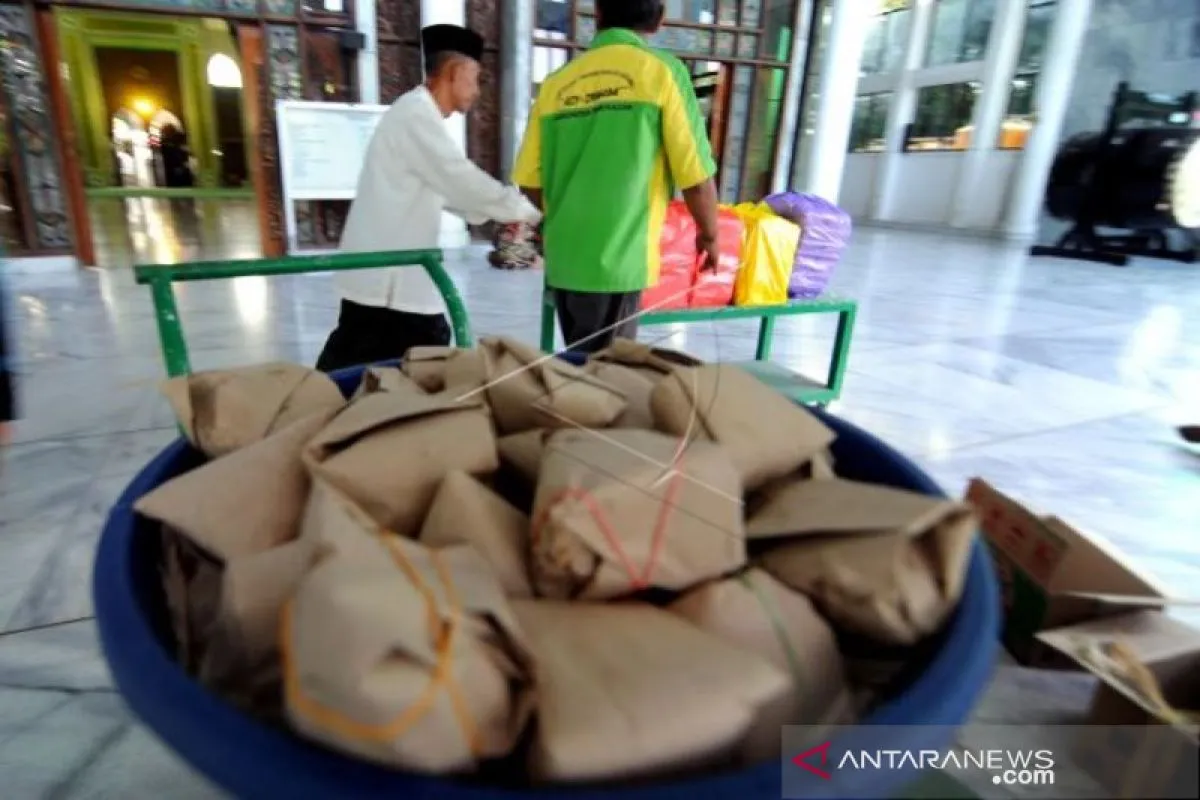 Takmir memindahkan nasi bungkus hasil pemberian dermawan di Masjid Agung Asy-Syuhadak, Pamekasan, Jawa Timur, Senin (6/5/2019). Pada hari pertama bulan Ramadhan 1440 H terkumpul sekitar 500 nasi bungkus yang selanjutnya akan diberikan kepada musyafir dan kaum duafa di sekitar masjid tersebut. ANTARA FOTO/Saiful Bahri/ama.