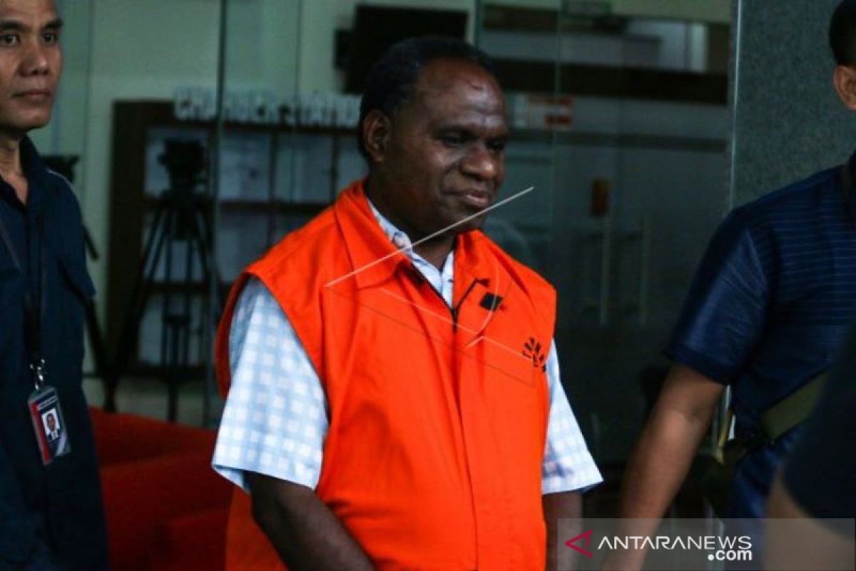Mantan Kadis Pekerjaan Umum Bina Marga Provinsi Papua Mikael Kambuaya mengenakan rompi tahanan seusai menjalani pemeriksaan di Gedung KPK, Jakarta, Senin (1/7/2019). KPK menahan Mikael atas kasus dugaan korupsi pengadaan pekerjaan peningkatan jalan Kemiri-Depapre Kabupaten Jayapura pada APBD-P Pemprov Papua tahun anggaran 2015. ANTARA FOTO/Rivan Awal Lingga/aww.