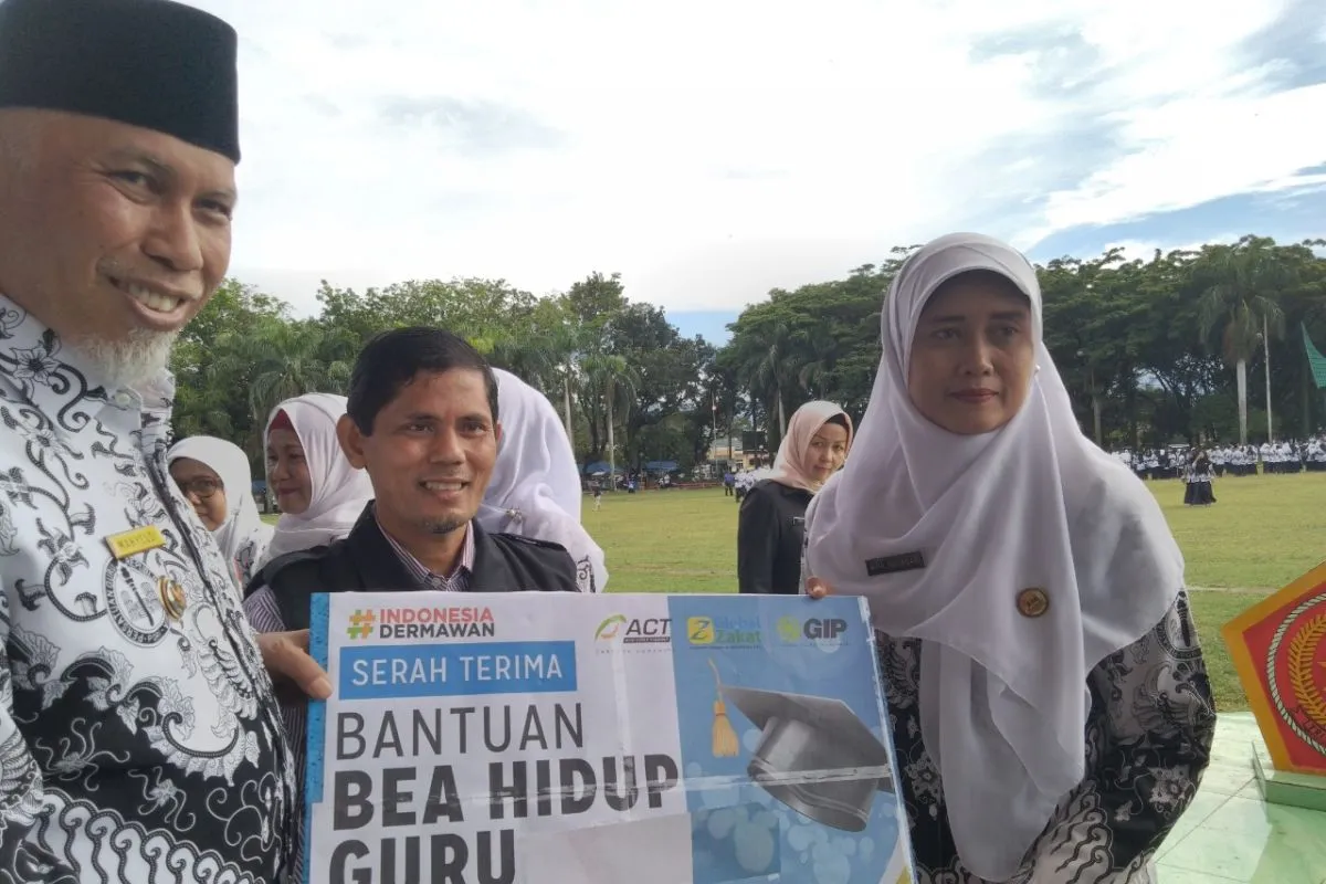 Padang (ANTARA) - Global Zakat-Aksi Cepat Tanggap (ACT) memberikan bea hidup bagi tiga guru honorer yang kondisinya prasejahtera di Kota Padang, Sumatera Barat usai upacara peringatan Hari Guru di Lapangan Imam Bonjol, Senin.