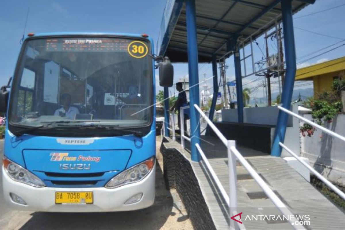 Penumpang menaiki bus Trans Padang koridor empat, di halte Jalan Bypass, Padang, Sumatera Barat. Pemkot Padang mengaktifkan rute baru koridor empat untuk moda transportasi massal itu dengan rute sepanjang Jalan Bypass Padang, yakni mulai dari Anak Aia hingga ke Teluk Bayur sejauh 27,2 kilometer. ANTARA FOTO/Iggoy el Fitra/hp.