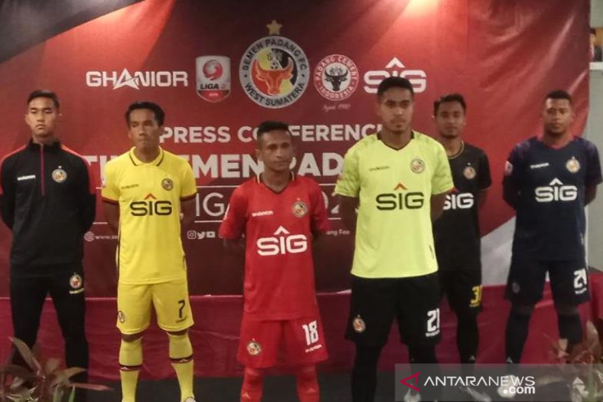 Sejumlah pemain Semen Padang FC memperagakan jersey baru untuk Liga 2 2020, di Padang, Sumatera Barat, Kamis (12/3/2020). Semen Padang FC memperkenalkan jersey baru dan 26 pemainnya untuk menghadapi Liga 2 2020. ANTARA FOTO/Iggoy el Fitra/20