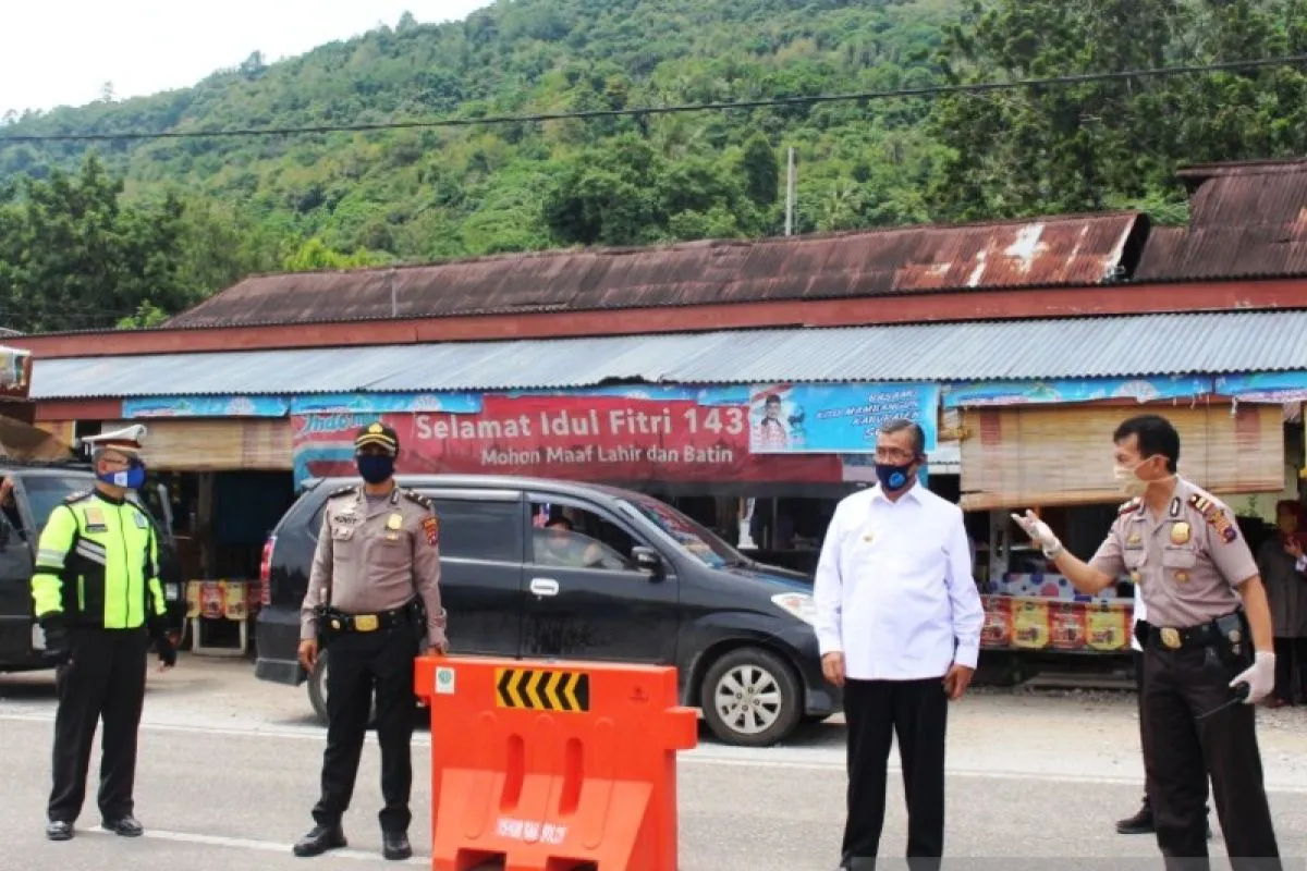 Bupati Solok, Gusmal memberikan arahan pada petugas posko perbatasan dalam memeriksa kendaraan. (ANTARA/Humas)