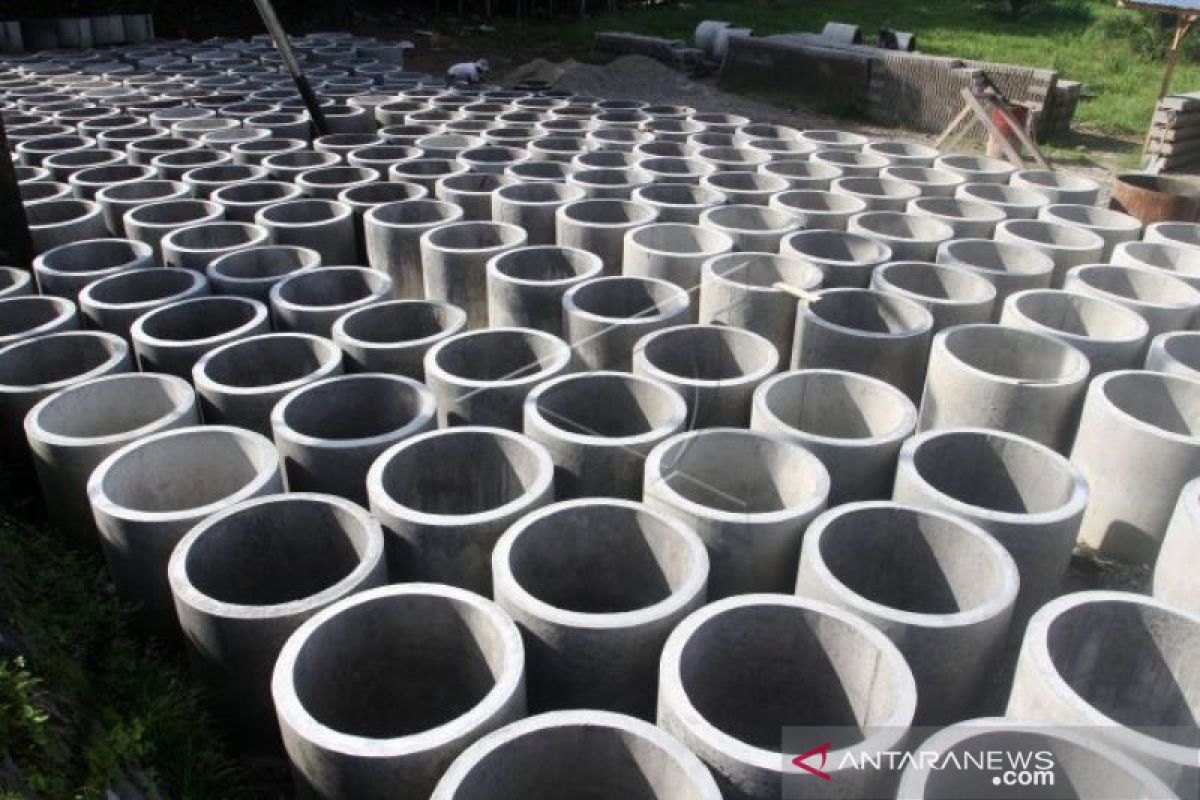 Pekerja menyelesaikan pembuatan beton gorong-gorong di daerah Batang Anai, Kabupaten Padang Pariaman, Sumatera Barat, Senin (3/8/2020). Permintaan beton gorong-gorong yang dijual kisaran Rp75 ribu hingga Rp200 ribu per buah tersebut mengalami penurunan sekitar 50 persen seiring terhentinya pembangunan infrastruktur di masa pandemi COVID-19. ANTARA FOTO/Muhammad Arif Pribadi/wsj.