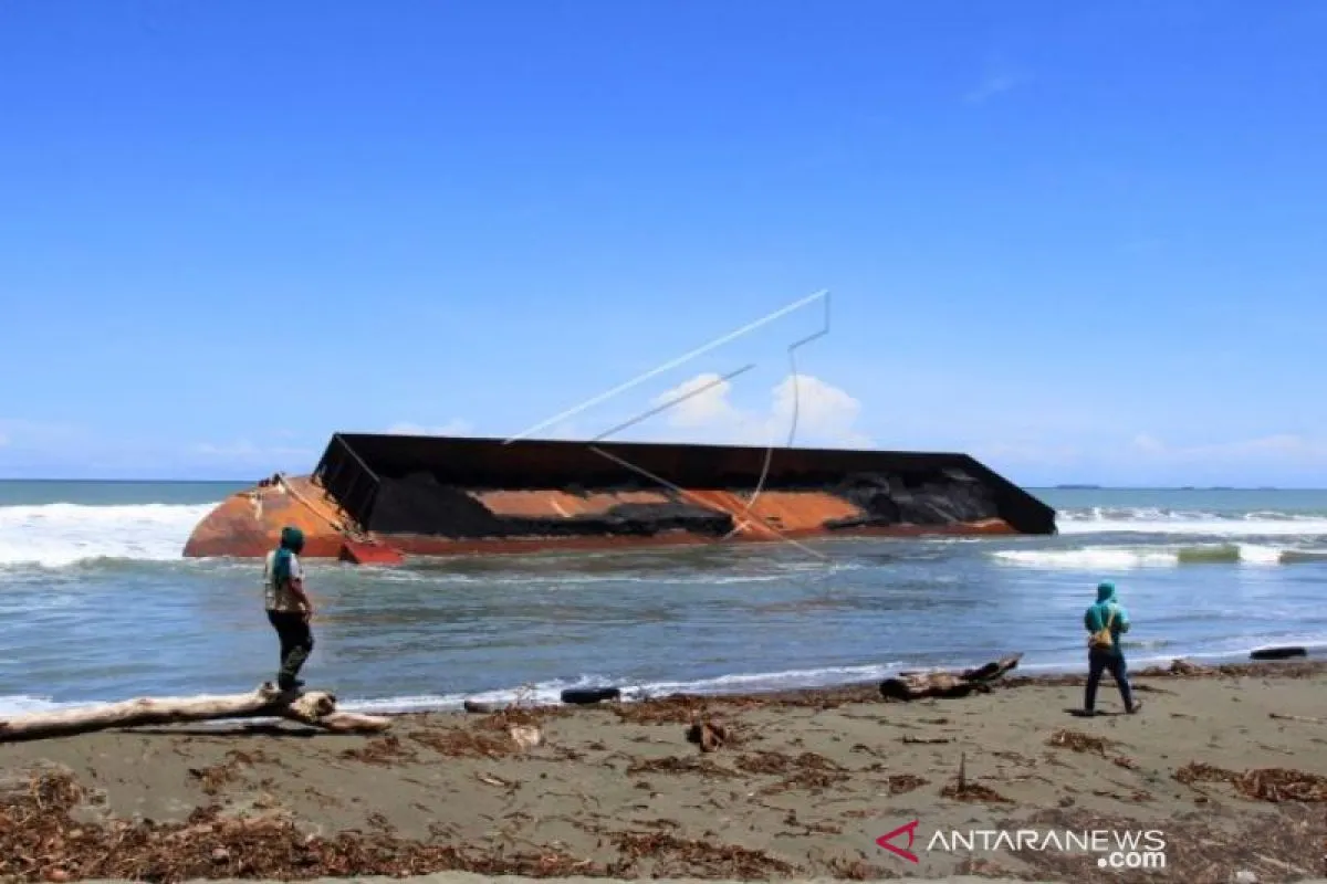 Warga melihat kapal tongkang pengangkut batu bara yang terdampar di Kawasan Pantai Naga Permai Desa Gampong Lhok, Kecamatan Kuala Pesisir, Nagan Raya, Aceh, Jumat (7/8/2020). Kapal tongkang milik salah satu perusahaan pengangkut batu bara tersebut terdampar sejak Selasa (28/7/2020) akibat cuaca buruk dan gelombang tinggi yang melanda perairan laut Samudera Hindia dan hingga saat ini belum dievakuasi ke laut lepas. ANTARA FOTO/Syifa Yulinnas/pras.