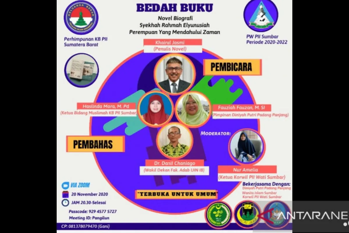 Padang (ANTARA) - Perhimpunan Keluarga Besar Pelajar Islam Indonesia (KB-PII) Sumatera Barat selenggarakan kegiatan Bedah Novel Biografi Rahmah Elyunusiah “Perempuan Yang Mendahului Zaman” karya Wartawan Senior Khairul Jasmi, yang akan dilaksanakan secara virtual, pada hari Jumat, 20 November 2020, mulai Pukul 20.00.