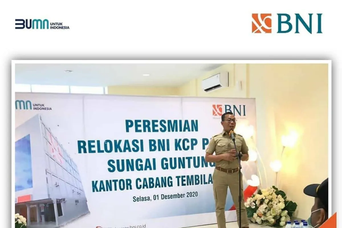 Relokasi BNI KCP Pasar Sungai Guntung ini sudah diresmikan secara langsung oleh Pemimpin Wilayah Sumbar, Riau, dan Kepri Hidayat Safwan dan didampingi oleh Pemimpin Kantor Cabang BNI Tembilahan Dedy Hermawan pada Selasa, 1 Desember 2020.