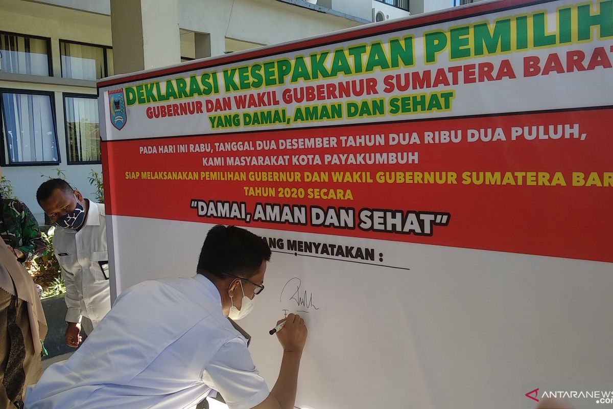 Payakumbuh, (ANTARA) - Pemerintah Kota Payakumbuh, Sumatera Barat bersama para pemangku kepentingan, unsur masyarakat, Komisi Pemilihan Umum, Badan Pengawas Pemilu dan perwakilan partai politik di daerah itu mendeklarasikan Pilkada 2020 yang damai, aman dan sehat.