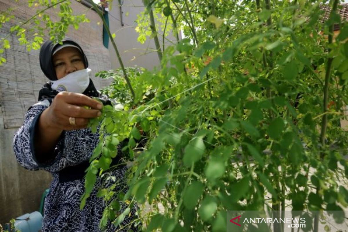 Umi Sriwahyuni mengambil daun kelor untuk selanjutnya dikeringkan di Lingkungan Balongkrai, Kelurahan Pulorejo, Kota Mojokerto, Jawa Timur, Kamis (17/12/2020). Produk olahan daun kelor yang dipercaya meningkatkan daya tahan tubuh untuk mencegah penyebaran COVID-19 tersebut dijual mulai Rp125 ribu per kg untuk bubuk kelor, daun kelor kering Rp10 ribu per 100 kg serta teh daun kelor Rp13 ribu. ANTARA FOTO/Syaiful Arif/