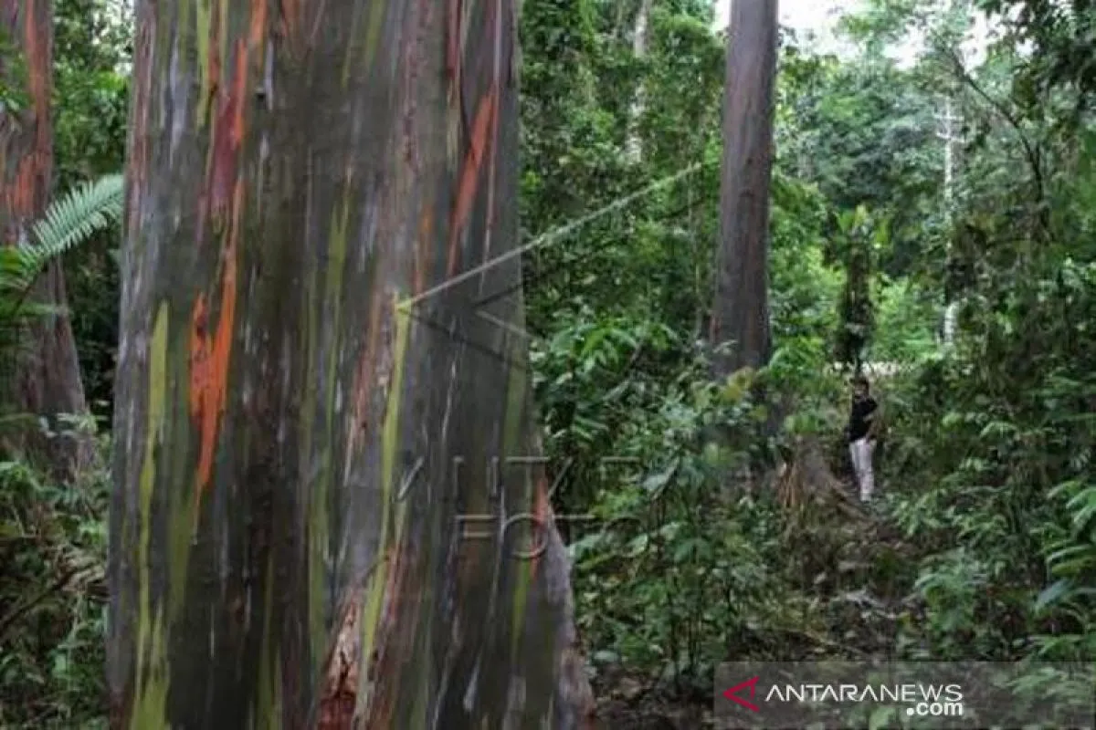 Pengunjung berdiri di bawah sejumlah pohon Leda (Eucalyptus deglupta) di kawasan Hutan Lindung Wakonti, Baubau, Sulawesi Tenggara, Selasa (22/12/2020). Pohon Leda yang memiliki warna khas loreng hijau tersebut mengandung minyak Atsiri pada bagian daun yang biasa dimanfaatkan untuk industri obat-obatan, makanan dan kosmetik. ANTARA FOTO/Jojon/wsj.