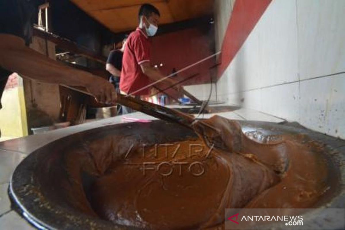 Pekerja mengaduk adonan gelamai di dapur Erina, Kota Payakumbuh, Sumatera Barat, Kamis (25/2/2021). Penganan khas Payakumbuh yang terbuat dari beras ketan, santan kelapa, dan gula merah itu dijual Rp60 ribuan per kilogram. ANTARA FOTO/Iggoy el Fitra/foc.