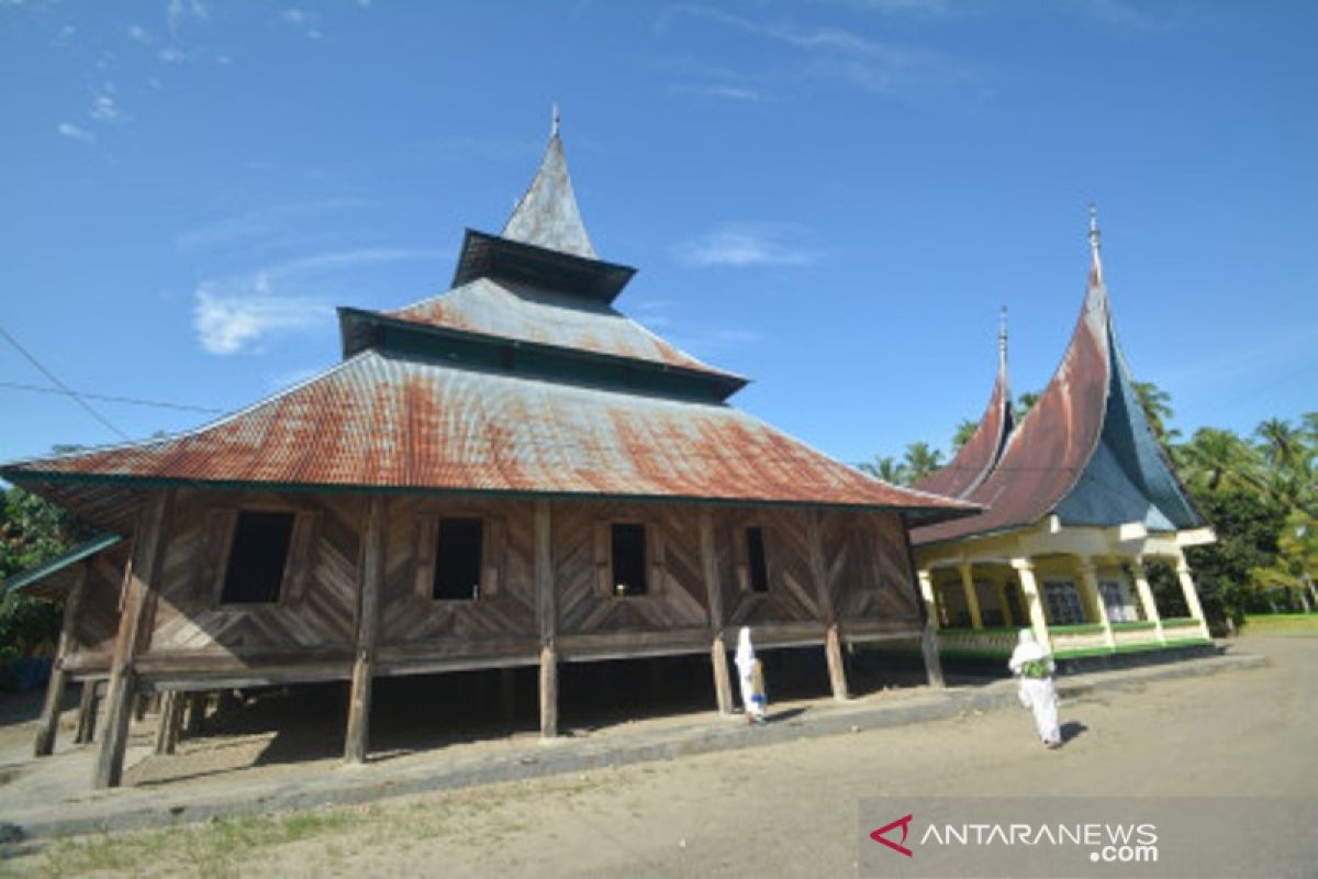 Dua jamaah melintas di depan Surau Gadang Syekh Burhanuddin, Nagari Tanjung Medan, Ulakan, Kabupaten Padangpariaman, Sumatera Barat, Selasa (20/4/2021). Data Balai Pelestarian Cagar Budaya (BPCB) Sumbar, surau yang tercatat sebagai salah satu cagar budaya tertua itu dibangun ulama penyebar Islam di Minangkabau, Syekh Burhanuddin pada tahun 1680. ANTARA FOTO/Iggoy el Fitra/hp.