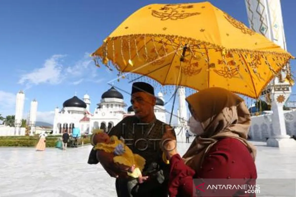 Pemuka agama menggendong bayi pada prosesi ritual dan adat turun tanah anak di halaman Masjid Raya Baiturrahman, Banda Aceh, Kamis (22/7/2021). Upacara ritual dan adat turun tanah merupakan tradisi masyarakat Aceh yang menyimbolkan kesucian ibu yang telah 44 hari melewati masa persalinan dan untuk pertama kalinya bayi menginjakkan kaki di tanah. ANTARA FOTO / Irwansyah Putra/rwa.
