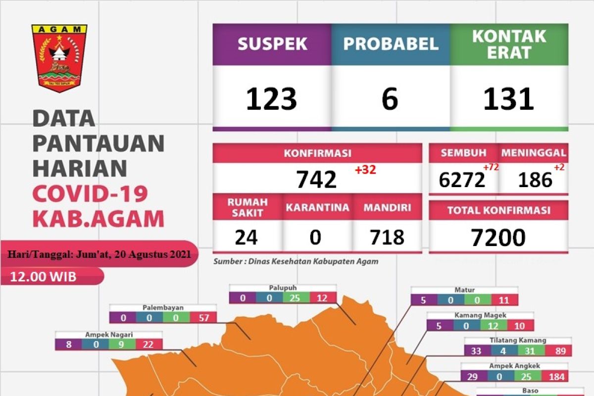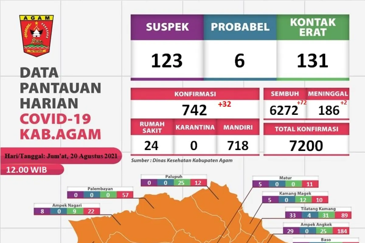 Sebaran kasus positif COVID-19 di Kabupaten Agam, Jumat (20/8). (Antarasumbar/Dok Pemkab Agam)