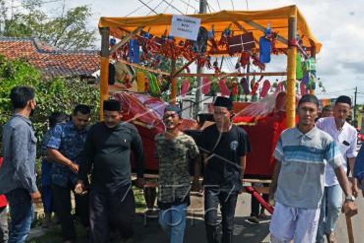 Sejumlah warga menggotong barang sedekah saat Perayaan Maulid Nabi Muhammad di Kampung Sukalila, Kelapa Dua, Serang, Banten, Selasa (19/10/2021). Perayaan Maulid Nabi Muhammad berlangsung setiap Bulan Mulud pada penanggalan Jawa dilangsungkan dengan mengumpulkan dan membagi-bagikan sedekah untuk warga yang tidak mampu. ANTARA FOTO/Asep Fathulrahman/aww.