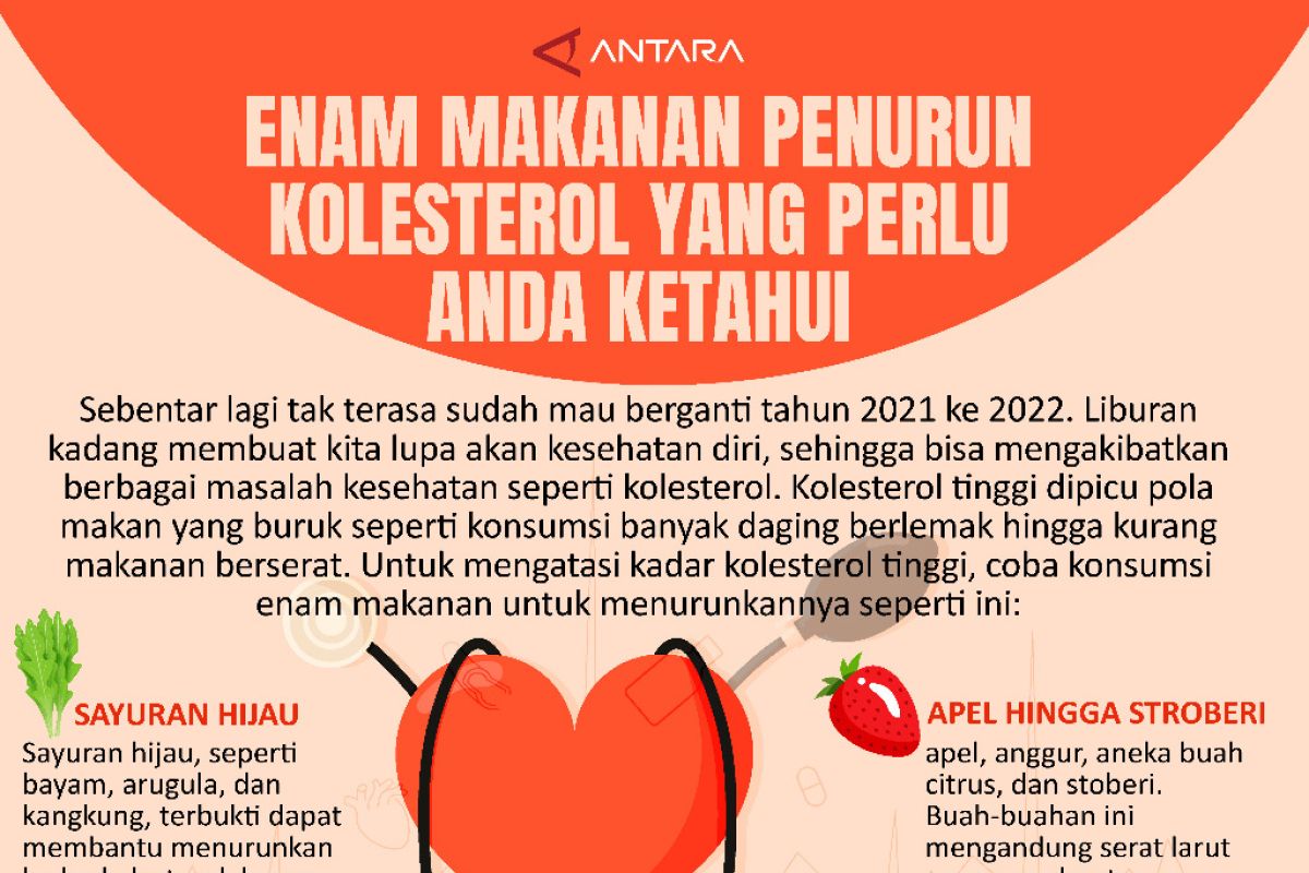 Padang (ANTARA) - Sebentar lagi tak terasa sudah mau berganti tahun 2021 ke 2022. Liburan kadang membuat kita lupa akan kesehatan diri, sehingga bisa mengakibatkan berbagai masalah kesehatan seperti kolesterol. Kolesterol tinggi dipicu pola makan yang buruk seperti konsumsi banyak daging berlemak hingga kurang makanan berserat. Untuk mengatasi kadar kolesterol tinggi, coba konsumsi enam makanan untuk menurunkannya seperti ini:
