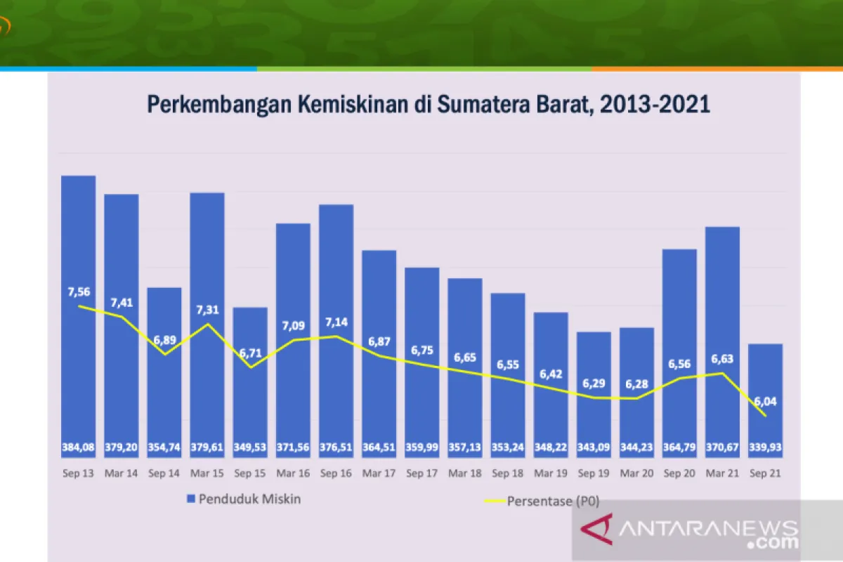 Pada Maret 2021 jumlah penduduk miskin di Sumbar mencapai 370,67 ribu orang atau 6,63 persen, September 2021 turun jadi 339,93 ribu orang atau berkurang sekitar 30 ribu orang,