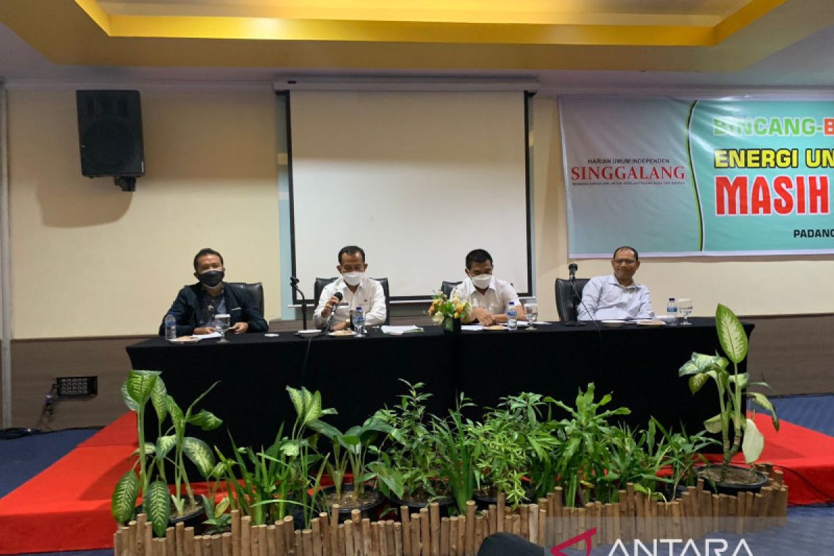 Diskusi energi bersama Kadis ESDM Sumbar Herry Martinus, SAM PT Pertamina I Made Wira, Kasubdit IV Ditreskrimsus Polda Sumbar Kompol Firdaus dan pengamat ekonomi di Padang. (Antarasumbar/HO)