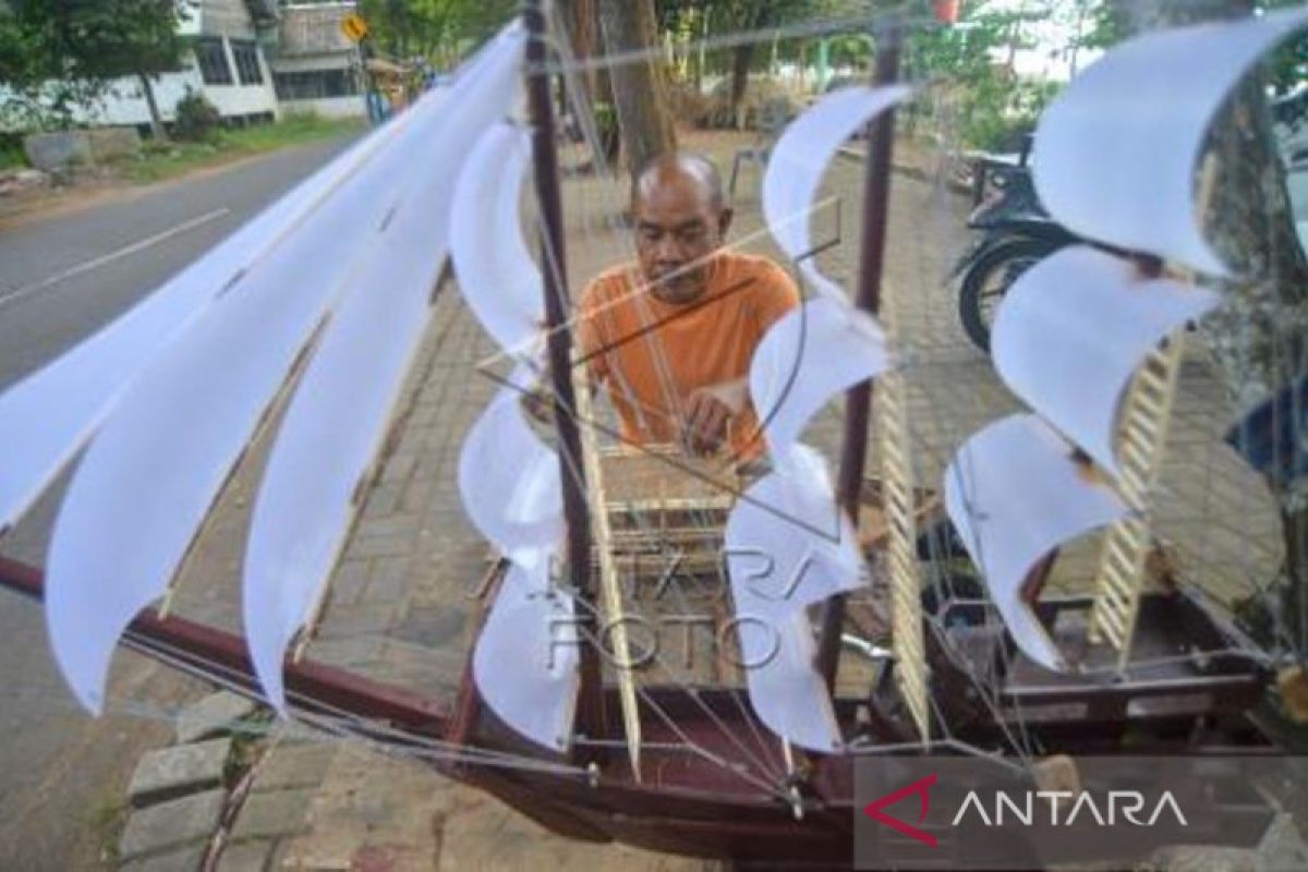 Perajin miniatur kapal pinisi, Angah menyelesaikan kapal buatannya di Pantai Lohong, Pariaman, Sumatera Barat, Rabu (23/2/2022). Miniatur kapal pinisi tersebut ditawarkan kepada wisatawan pantai sebagai suvenir mulai Rp500 ribu hingga Rp1,5 juta per buah. ANTARA FOTO/Iggoy el Fitra/rwa.