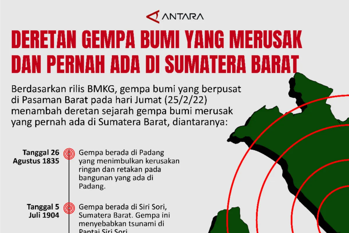 Padang (ANTARA) - Berdasarkan rilis BMKG, gempa bumi yang berpusat di Pasaman Barat pada hari Jumat (25/2/22) menambah deretan sejarah gempa bumi merusak yang pernah ada di Sumatera Barat, diantaranya: