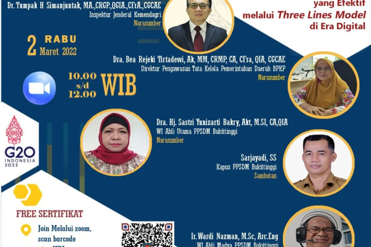 Padang (ANTARA) - Pusat Pengembangan Sumber Daya Manusia (PPSDM) Kemendagri Regional Bukittinggi akan menggelar webinar dengan tema Membudayakan Pengawasan Internal Manajemen yang efektif melalui Three Lines Model pada 2 Maret 2022.