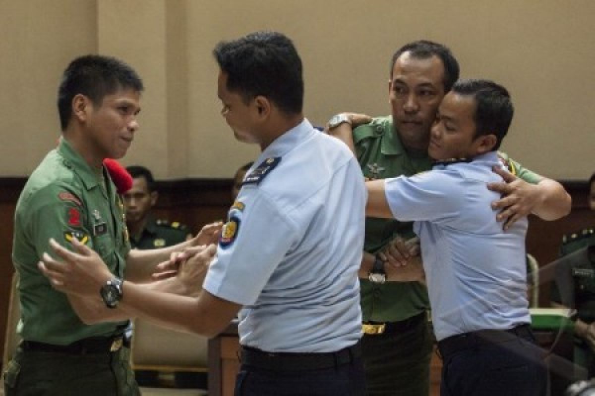 Dua dari 12 terdakwa anggota Kopassus Grup II Kandang Menjangan Kartasura, Serda Ucok Tigor Simbolon (kiri) dan Serda Sugeng Sumaryanto (dua dari kanan) meminta maaf kepada saksi dalam sidang militer lanjutan di Pengadilan Militer II-11 Yogyakarta, Bantul, Yogyakarta. (Antara)