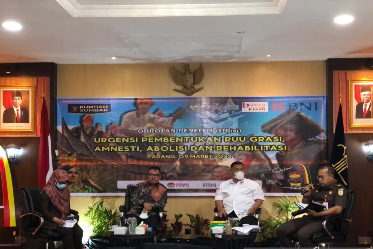 Padang (ANTARA) - Kantor Wilayah Kementerian Hukum dan HAM (Kanwil Kemenkumham Sumatera Barat (Sumbar) menggelar diskusi daring Obrolan Peneliti (OPini) dengan tema "Urgensi Pembentukan RUU Grasi, Amnesti Abolisi dan Rehabilitasi (GAAR)".