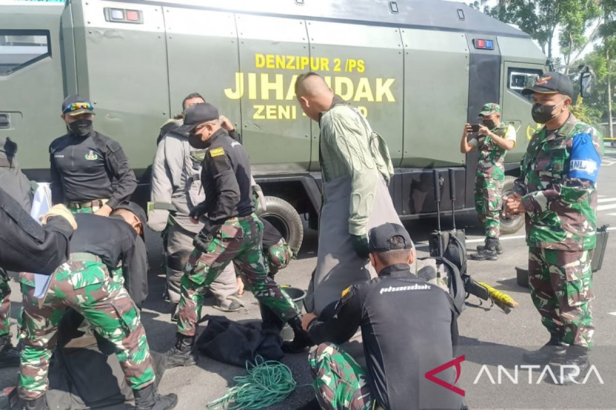 Tim Jihandak telah menggunakan alat pelindung bersiap memasuki gedung untuk mencari atau mendeteksi bahan peledak yang diinformasikan. Sekitar 15 menit mencari, Tim Jihandak menemukan kotak kecil di balik meja yang diduga bahan peledak.