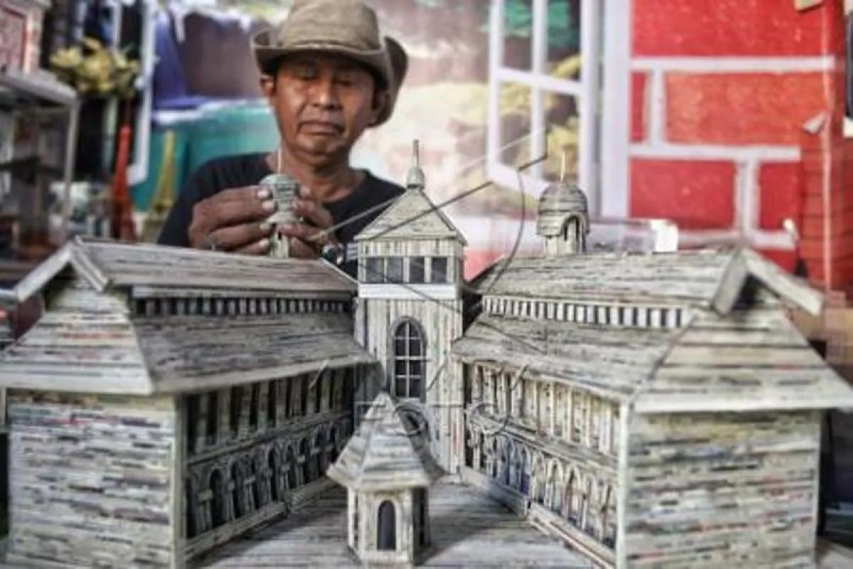 Perajin menyelesaikan kerajinan berbahan kertas koran bekas di Kebomas, Gresik, Jawa Timur, Rabu (22/6/2022). Kerajin daur ulang koran bekas berupa miniatur bangunan dan alat transportasi tersebut dijual dengan harga Rp150 ribu hingga Rp7 juta per buah tergantung ukuran dan tingkat kesulitan serta dipasarkan melalui pameran kerajinan di wilayah Pulau Jawa. ANTARA FOTO/Rizal Hanafi/Zk/hp.