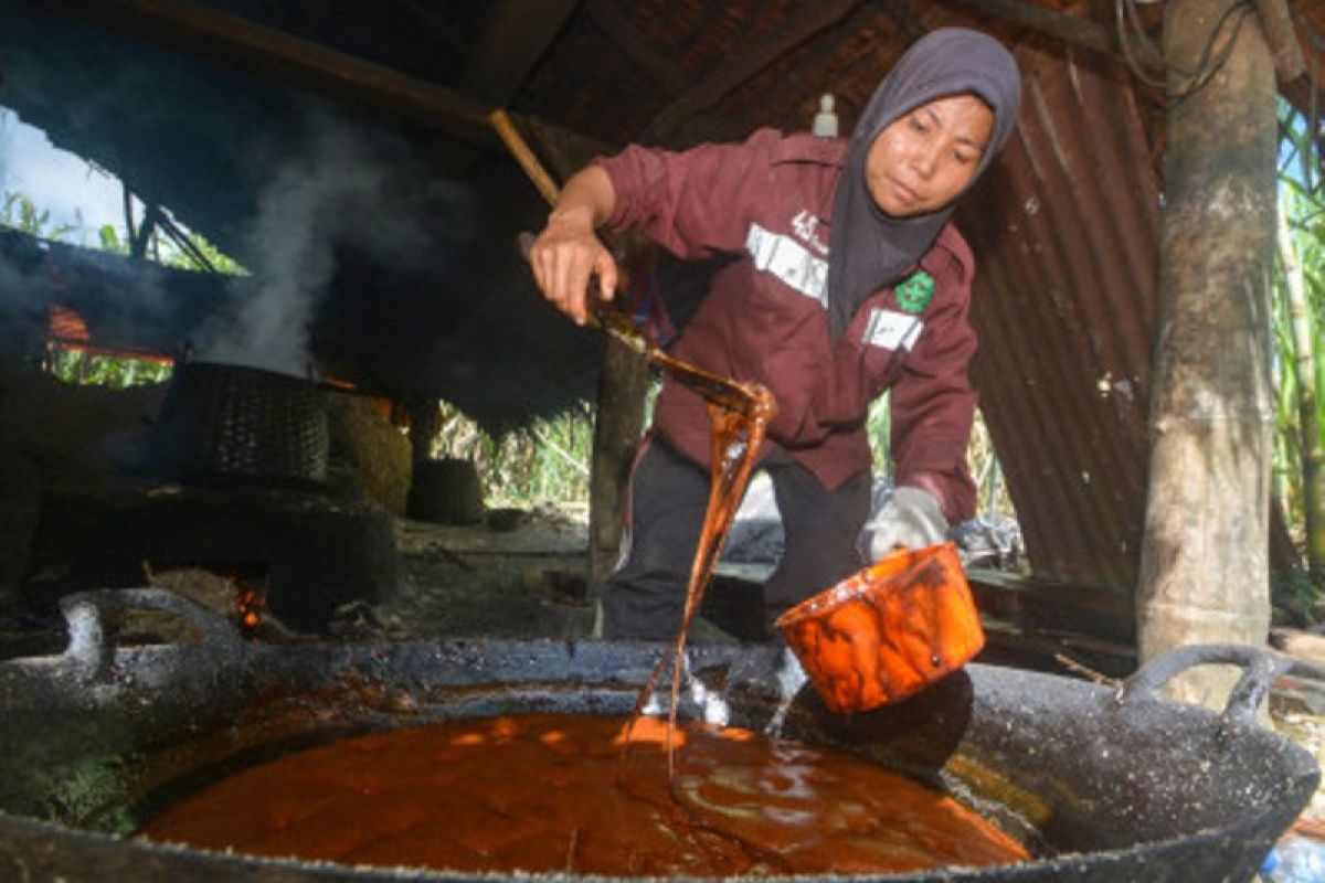 Perajin menyendok gula merah atau "Saka" di Nagari Lawang, Kabupaten Agam, Sumatera Barat, Rabu (22/6/2022). Menurut perajin, gula merah terbuat dari tebu yang diolah secara tradisional tersebut kini harga jualnya membaik mulai Rp12 ribu hingga Rp14 ribu per kilogram. ANTARA FOTO/Iggoy el Fitra/nym.