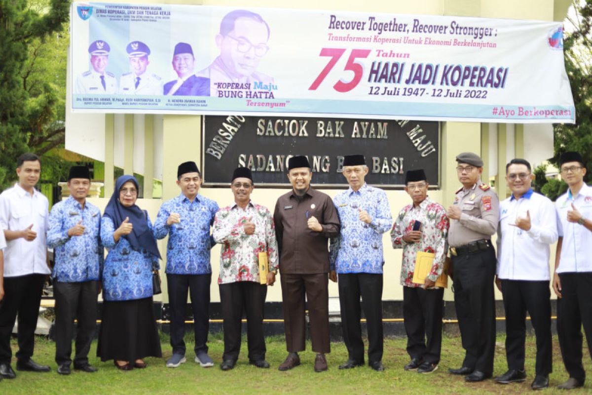 Painan (ANTARA) - Wakil Bupati Pesisir Selatan, Provinsi Sumatera Barat Rudi Hariyansah memimpin perayaan hari jadi koperasi ke-75 untuk tingkat kabupaten yang untuk tahun 2022 mengambil tema "Transformasi Koperasi Untuk Ekonomi Berkelanjutan" dan acara dipusatkan di halaman kantor bupati, Jumat (15/7).